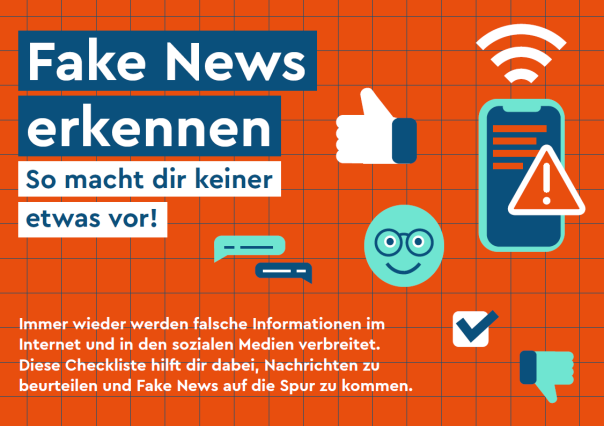 Die Checkliste "Fake News erkennen" unterstützt Ihre Nutzer*innen dabei, Falschinformationen zu erkennen und macht zudem auf das etwaige Schulungsangebot Ihrer Bibliothek aufmerksam. Insbesondere empfehlen wir, die Checkliste an Lehrer*innen weiterzugeben, damit sie im Klassenzimmer ausgehangen werden kann und Schulklassen für medienpädagiogische Schulungen in die Bibliothek kommen.